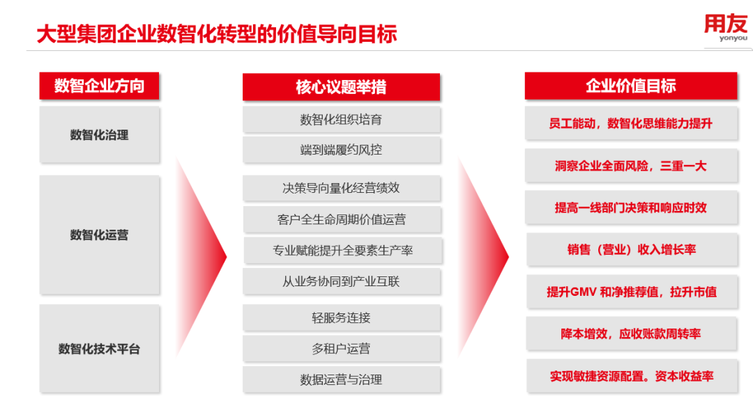 大型企業(yè)數(shù)智化轉(zhuǎn)型會面對各種聲音,但用友建議企業(yè)要回歸經(jīng)營本質(zhì),從底層的管理邏輯和業(yè)務(wù)邏輯出發(fā),定位自身所處的階段,打造與企業(yè)經(jīng)營管理相匹配的數(shù)智化平臺,從而實現(xiàn)價值創(chuàng)造。